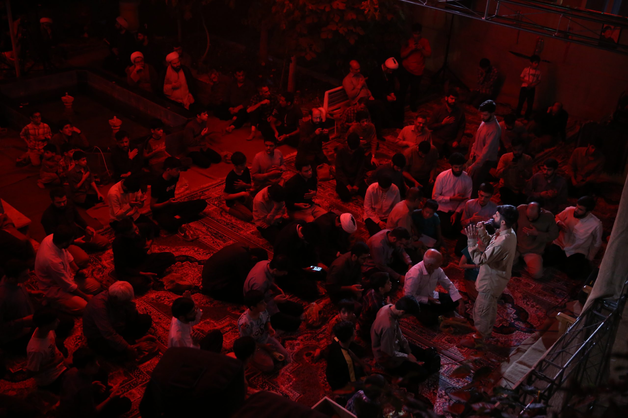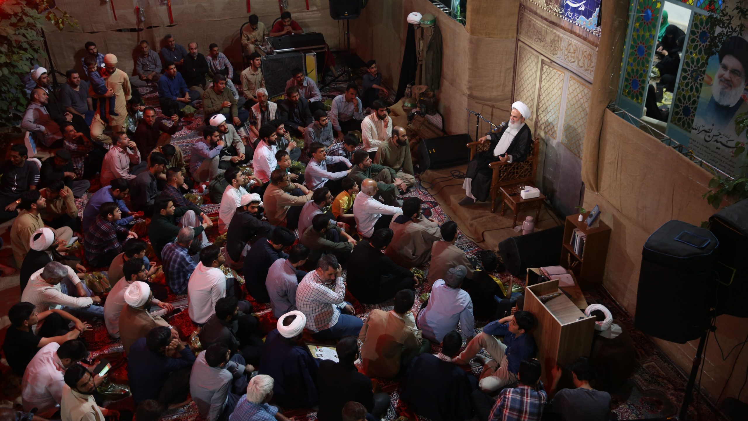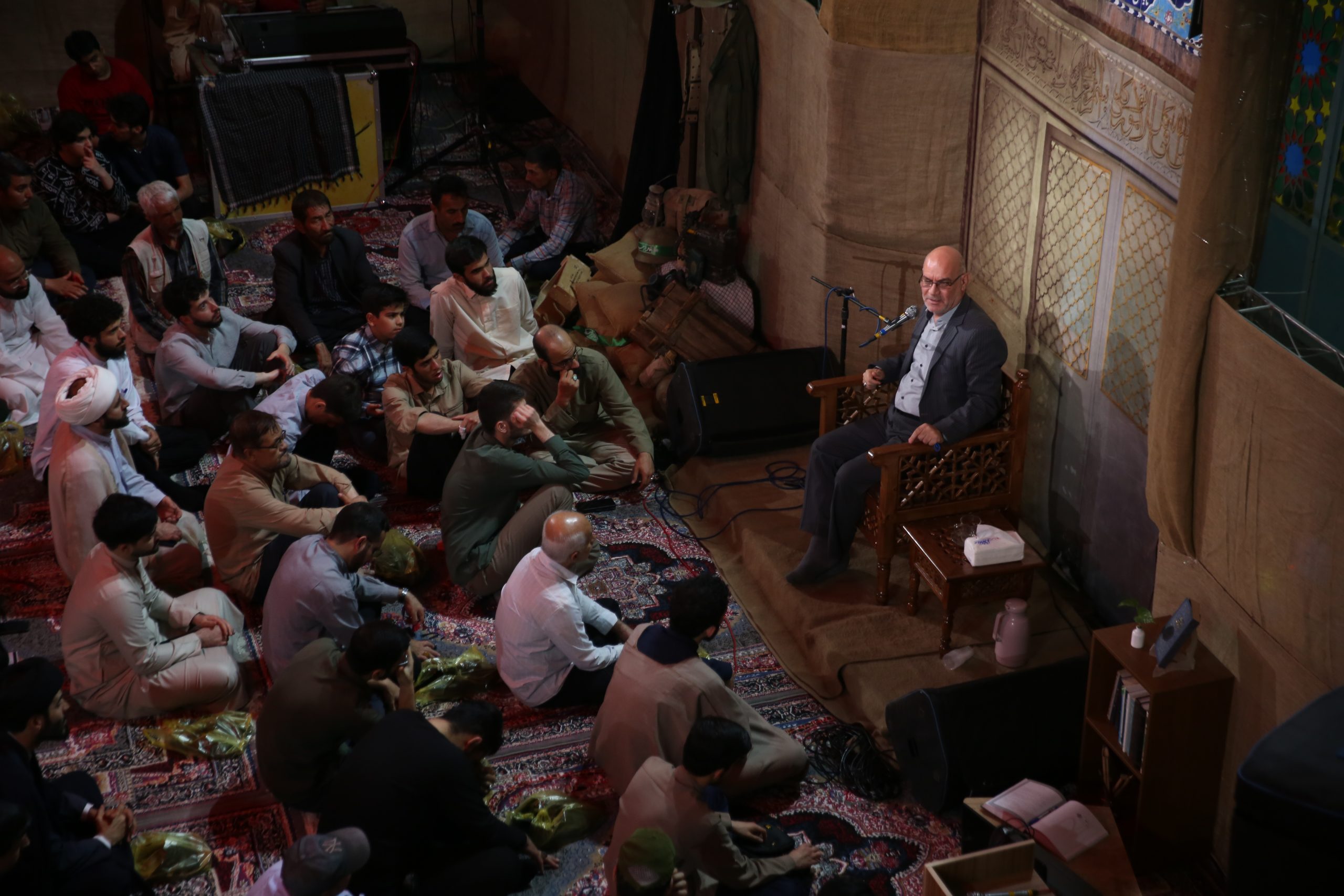 آماده سازی مراسم: نماز جماعت و تلاوت قرآن در حوالی مراسم(ایستگاه صلواتی و فروشگاه کتاب) اتاق کودک روایتگری حاج حسین کاجی سخنرانی حجت الاسلام پناهیان روضه و سینه زنی با نوای حاج ابوذر روحی عکس دست جمعی پایانی
